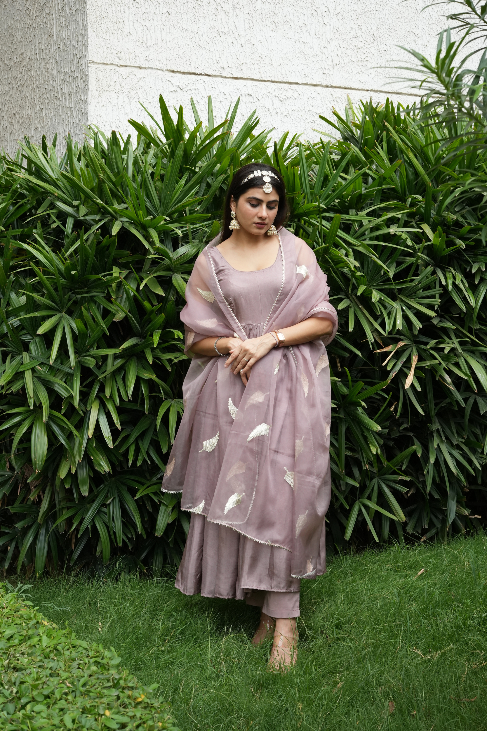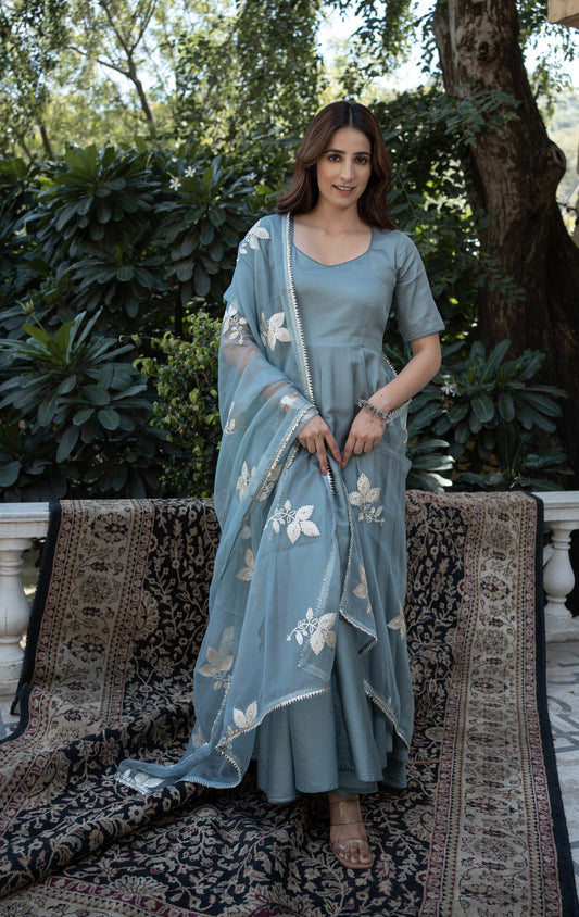 DUSKY BLUE FLORAL CHANDERI SUIT SET