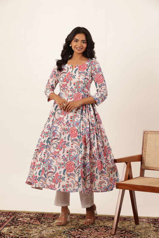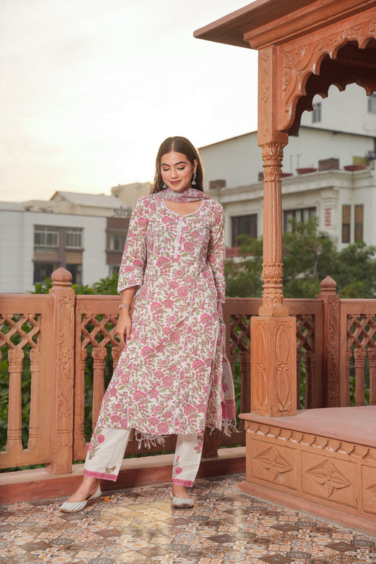 MILKY HANDBLOCK COTTON KURTI PANT SET